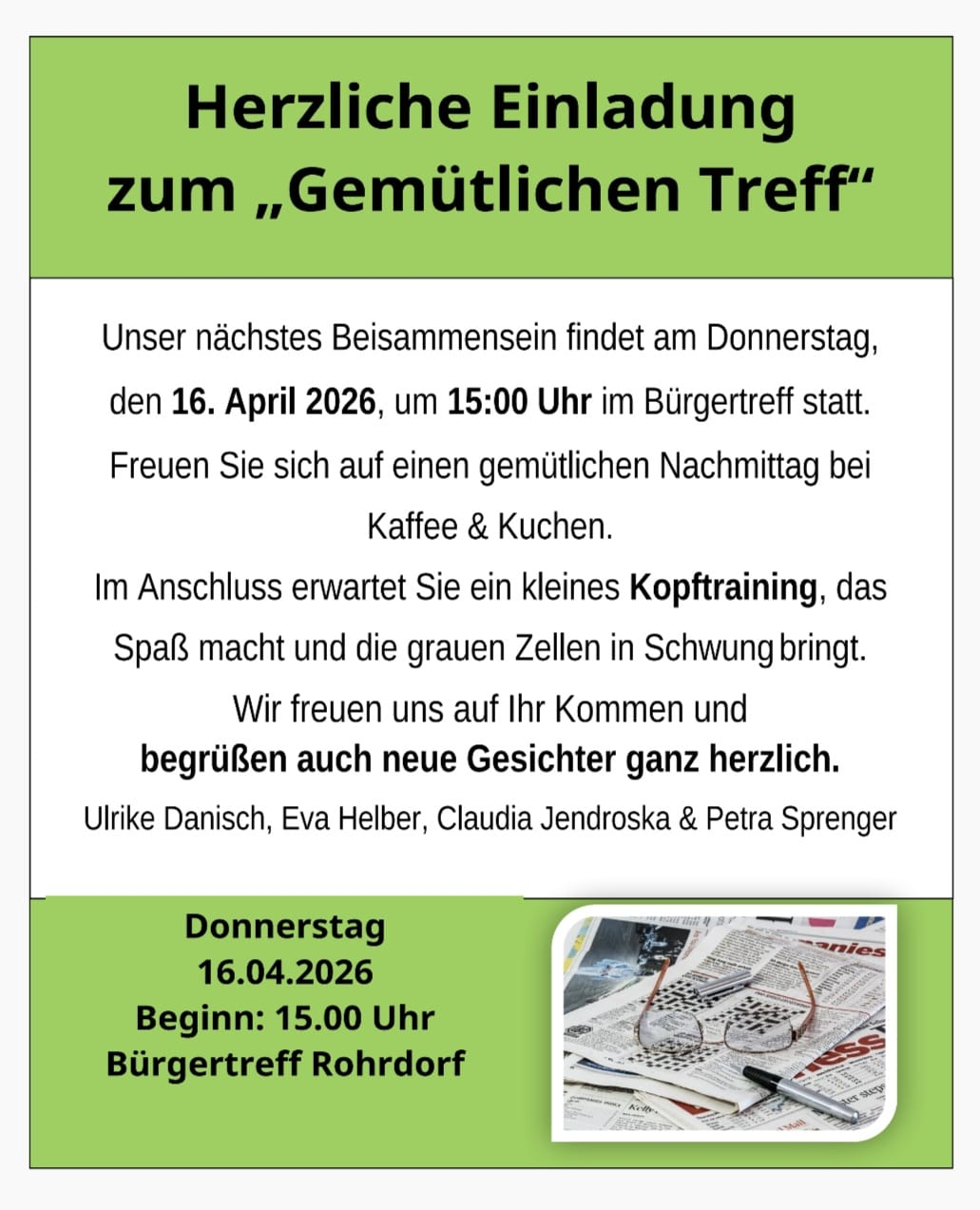 Am Donnerstag, 16. April 2026, um 15:00 Uhr findet im Bürgertreff der nächste „Gemütliche Treff“ statt.