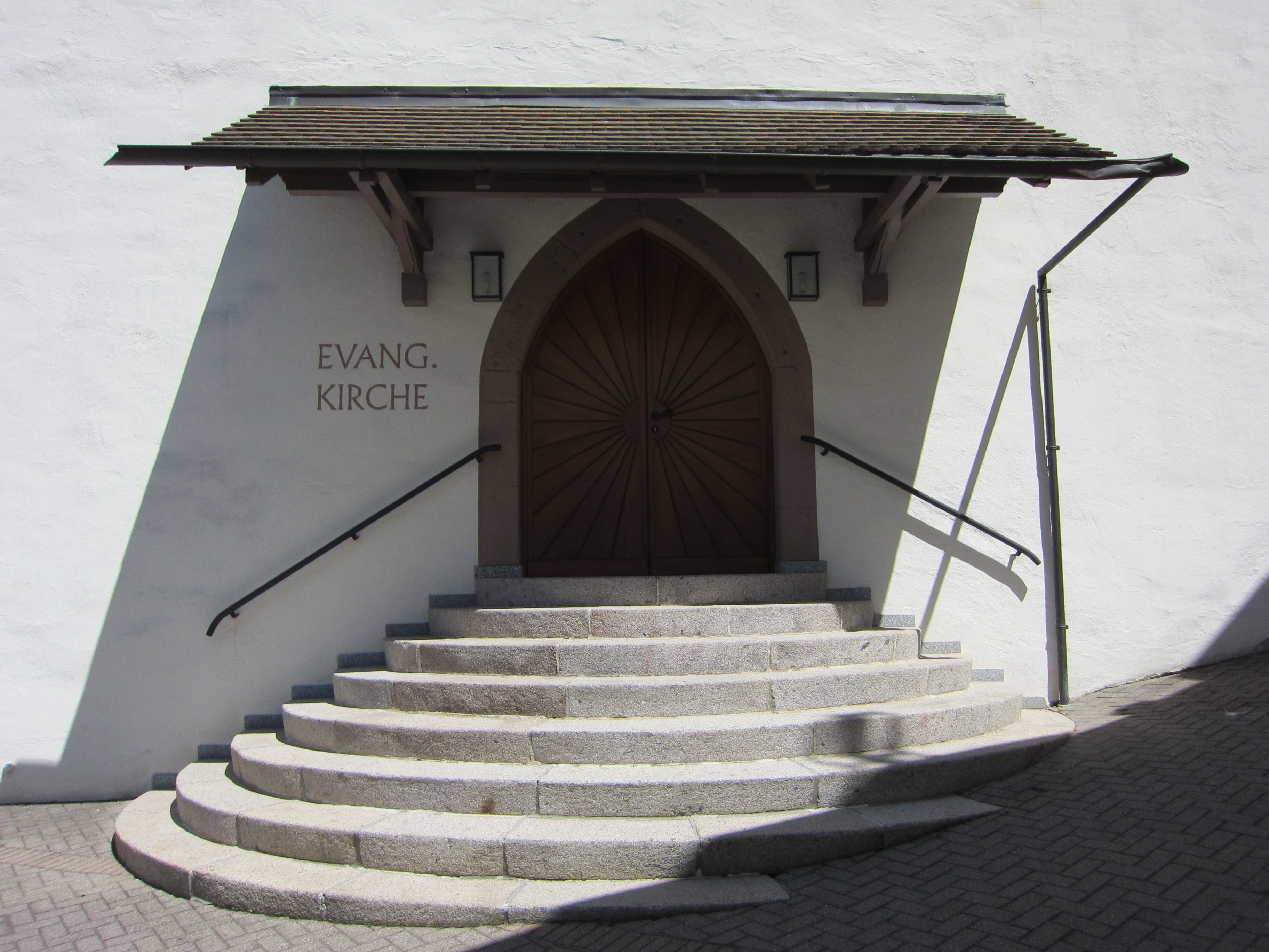 Die evangelische Kirche ist baulich Teil eines gemeinsamen Kirchengebäudes, verfügt jedoch über einen eigenen, klar abgegrenzten Kirchenraum mit separatem Eingang. Damit wird die Eigenständigkeit der evangelischen Kirchengemeinde gewahrt.