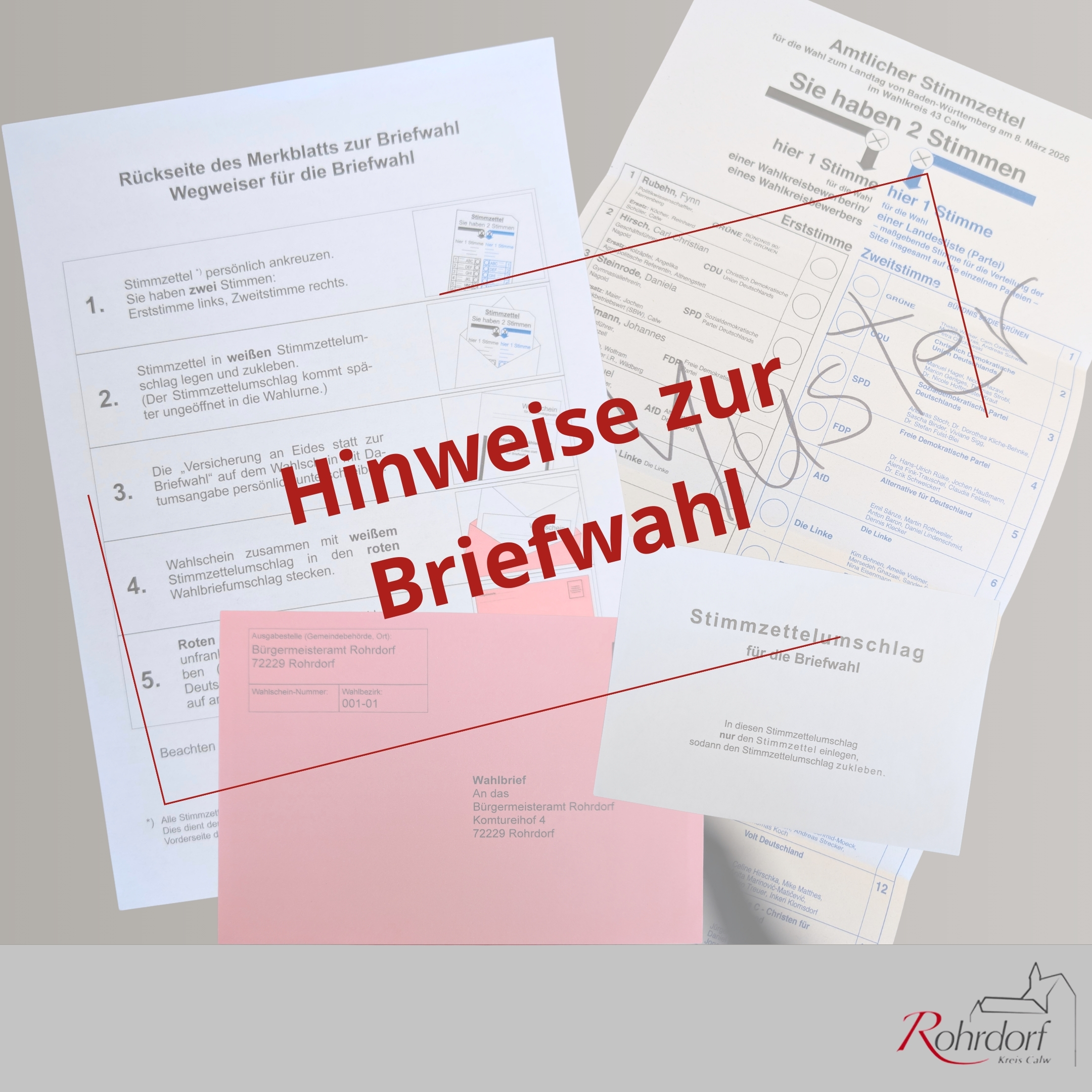 In Fällen plötzlicher Erkrankung ist die Beantragung von Briefwahlunterlagen noch am Wahlsonntag, den 08.03.2026, bis 15:00 Uhr möglich.